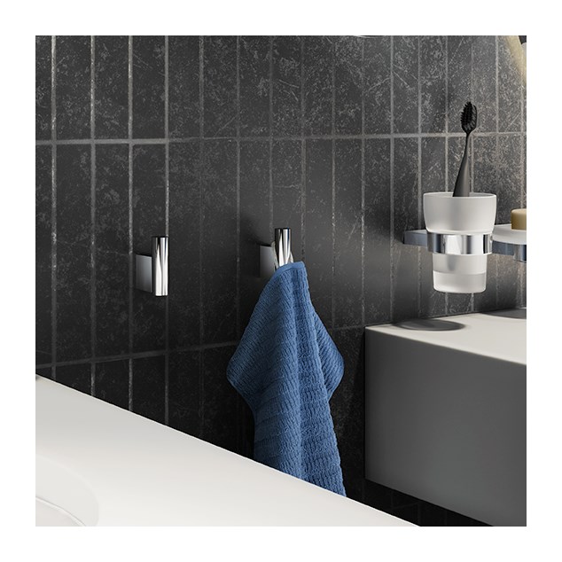 AIR-badeværelsesserien har et stramt design med luftig elegance. Du finder håndklædeholdere, toiletpapirholdere og brusekurve med en kerne af messing og poleret kromfinish. Naturlige og smukke materialer, der har en lang levetid.