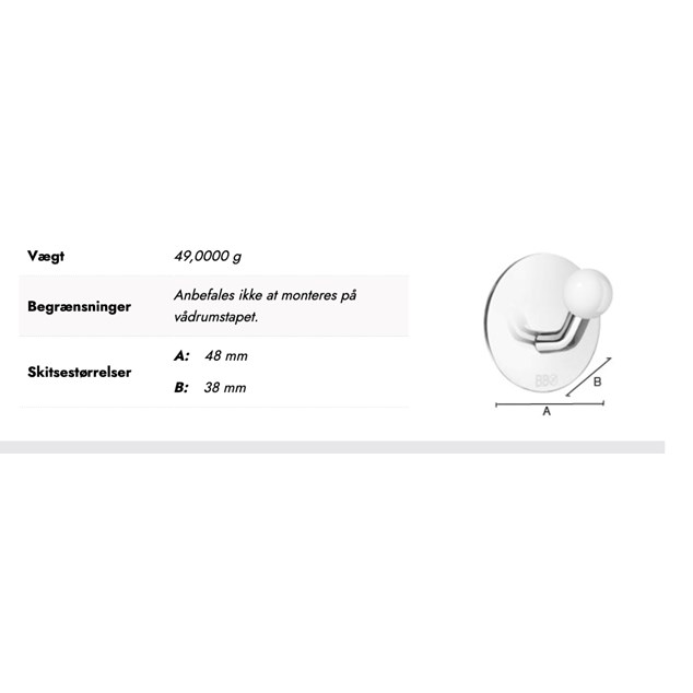 Enkelkrog Beslagsboden BK1085 forkromet ustfrit stål. Selvklæbende krog i forkromet rustfrit stål med hvid knop, rund design.
