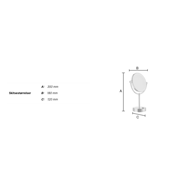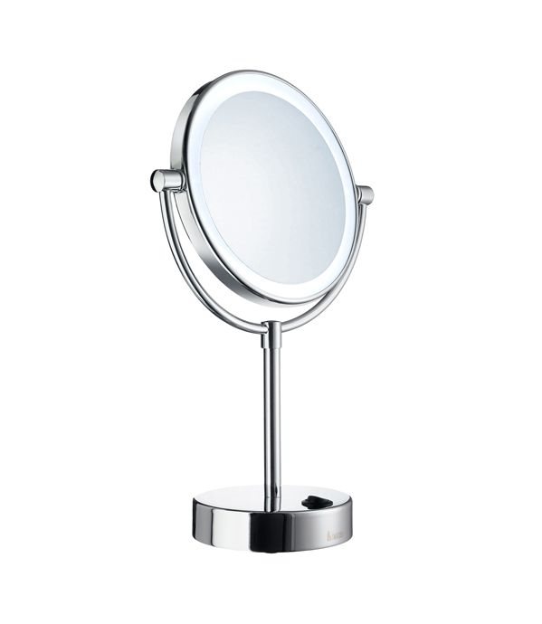 Sminke/Barberspejl Smedbo Outline FK474E, poleret krom. -Fritstående spejl med to spejlsider, normal og 5 x forstørrelse, Led-teknologi, Dual Light- varmt eller koldt lys, drives med 4 stk. 1,5V AA batterier (medfølger ikke).