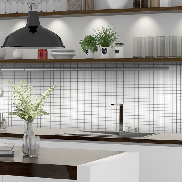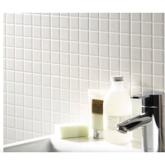 Mosaik Arredo Line er en hvid vægmosaik med mat glaseret overflade som har lige skåret kanter, hvilket gør att den kan monteres med meget smalle fuger.
