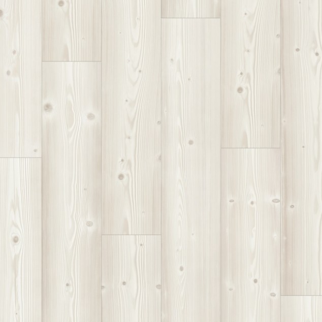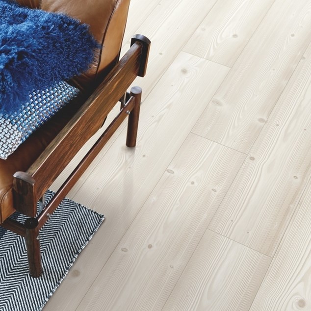 "Visby" Brushed White Pine, hvidt 1-stavslaminatgulv i fyrretræsdesign med elegant ekstramat finish. Herligt lyst gulv med blødt karakteristisk udseende og en dyb børstet struktur, som smukt fremhæver gulvets detaljer, såsom revner, knaster og skrabede effekter. Følelsen af træplanker forstærkes yderligere af faserne langs alle fire kanter. Et Pergo laminatgulv ”klasse 32” med fremragende slidstyrke.