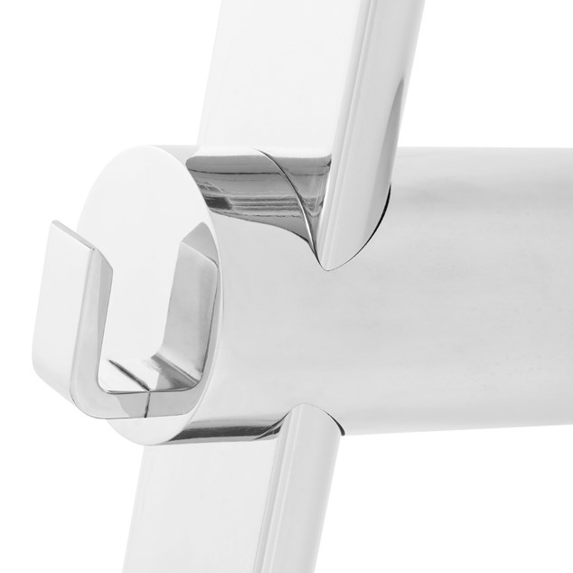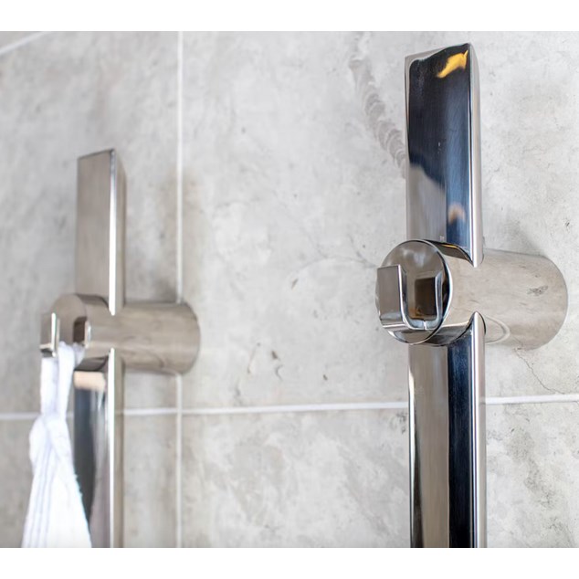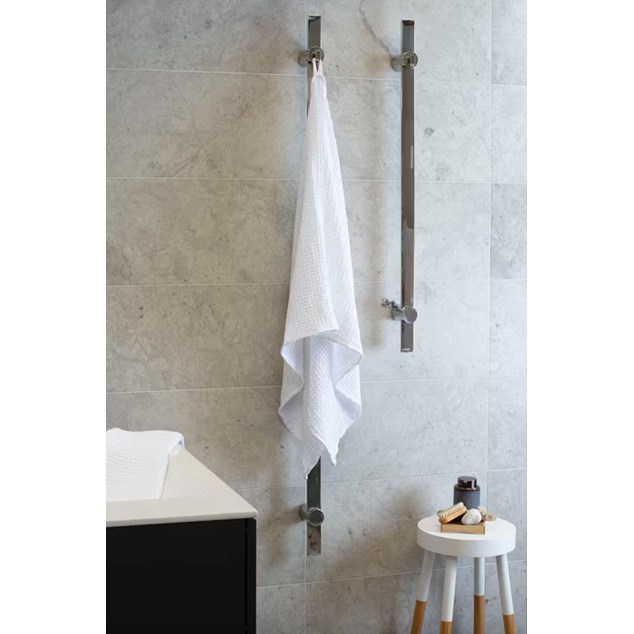 Håndklædetørreren er tilvirket af smukt, poleret rustfrit stål. Kontakten har indbygget LED-belysning, der giver et sobert og behageligt lys mod gulvet.