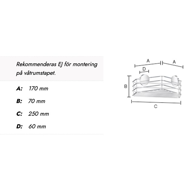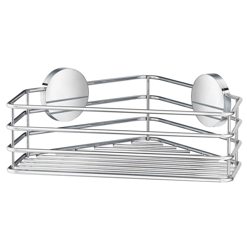 Hjørnebrusekurv Beslagsboden B1201 selvklæbende i forkromet rustfrit stål. Praktisk model som er specielt udviklet til hjørneplacering med stilren design som er tilpasset til alle badeværelser. Nem montering med 3M kvalitetstape.